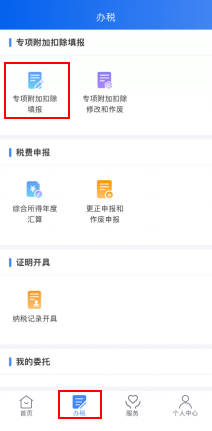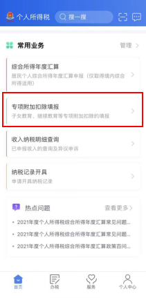 一步,進入申報界面。納稅人登錄手機個人所得稅APP后,可通過“首頁——常用業(yè)務(wù)——專項附加扣除填報”或“辦稅——專項附加扣除填報”進入專項附加扣除填報界面,并選擇“嬰幼兒照護費用”專項附加扣除。