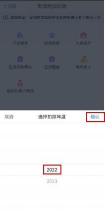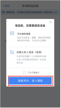 第二步,選擇扣除年度。進入申報界面后,“選擇扣除年度”設(shè)為2022年,點擊“確認(rèn)”后,系統(tǒng)會提示需要提前準(zhǔn)備的資料,納稅人仔細(xì)閱讀后,點擊“準(zhǔn)備完畢,進入填報”。