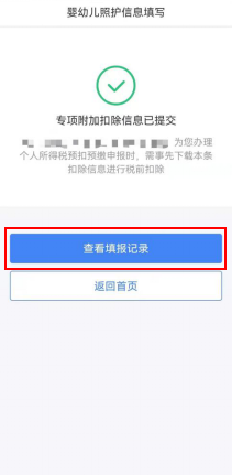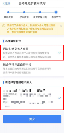 第五步,選擇申報方式。設(shè)置扣除比例后,進入“申報方式”界面,納稅人可根據(jù)實際情況選擇“通過扣繳義務(wù)人申報”或“綜合所得年度自行申報”任意一種方式。如果納稅人需要在每月發(fā)放工資薪金時享受專項附加扣除,需要選擇“通過扣繳義務(wù)人申報”,并核實扣繳義務(wù)人信息是否準(zhǔn)確。選擇完成后,點擊“提交”,即完成3歲以下嬰幼兒照護專項附加扣除填報流程,系統(tǒng)將彈出“專項附加扣除信息已提交”的提示。納稅人可以點擊“查看填報記錄”查看已經(jīng)申報的專項附加扣除信息。