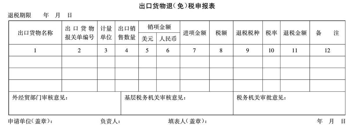 ????3.第11欄“退稅金額”,增值稅當(dāng)6×10>8時,11=8;當(dāng)6×10<8時,11=6×10;對外貿(mào)企業(yè)將出口貨物單獨(dú)記賬的,11=7×10。