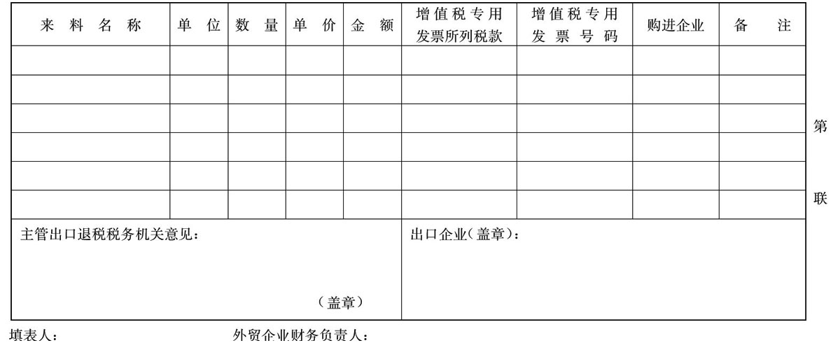 ????說明:1.此證明一式四聯(lián),由外貿(mào)企業(yè)填寫,第一聯(lián)由外貿(mào)企業(yè)交購料企業(yè),第二聯(lián)交主管出口退稅的稅務(wù)機(jī)關(guān),第三聯(lián)外貿(mào)企業(yè)留存,第四聯(lián)交主管征稅的稅務(wù)機(jī)關(guān)。