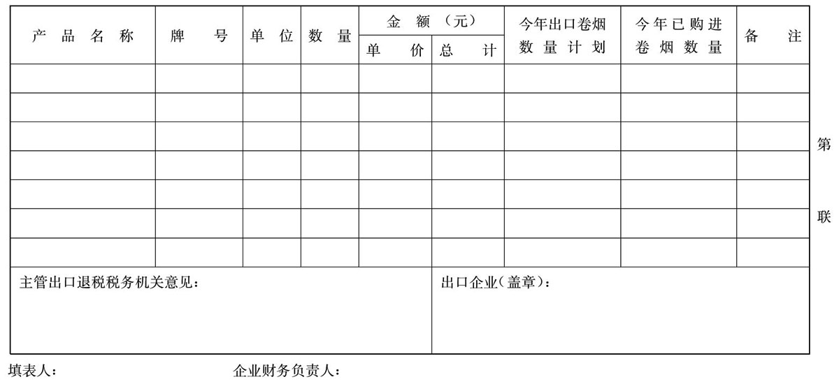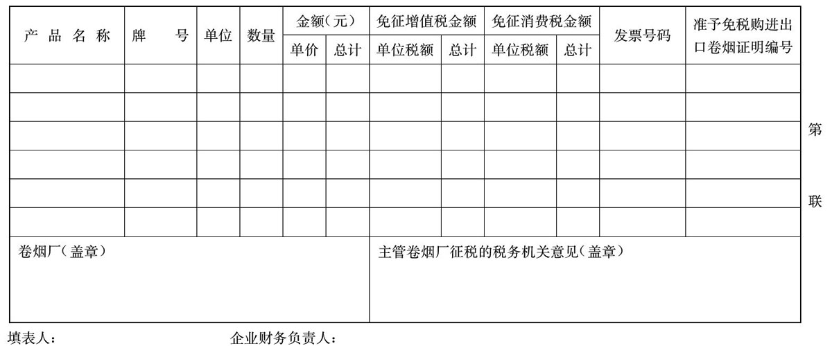 ????說明:1.此證明由卷煙廠填寫,一式四聯(lián),第一聯(lián)由卷煙廠所在地稅務(wù)局蓋章后直接寄送主管購貨企業(yè)出口退稅的稅務(wù)機(jī)關(guān),第二聯(lián)卷煙廠轉(zhuǎn)購貨企業(yè),第三聯(lián)留卷煙廠所在地稅務(wù)局,第四聯(lián)留卷煙廠。