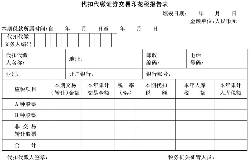 ????為了及時(shí)、準(zhǔn)確地了解證券交易印花稅代扣代繳情況,明確扣繳義務(wù)人的責(zé)任,代扣代繳證券交易印花稅的單位應(yīng)當(dāng)按月向主管稅務(wù)機(jī)關(guān)報(bào)送《代扣代繳證券交易印花稅報(bào)告表》?!洞鄞U證券交易印花稅報(bào)告表》式樣由國(guó)家稅務(wù)總局統(tǒng)一制定(附后),各地自行印制。