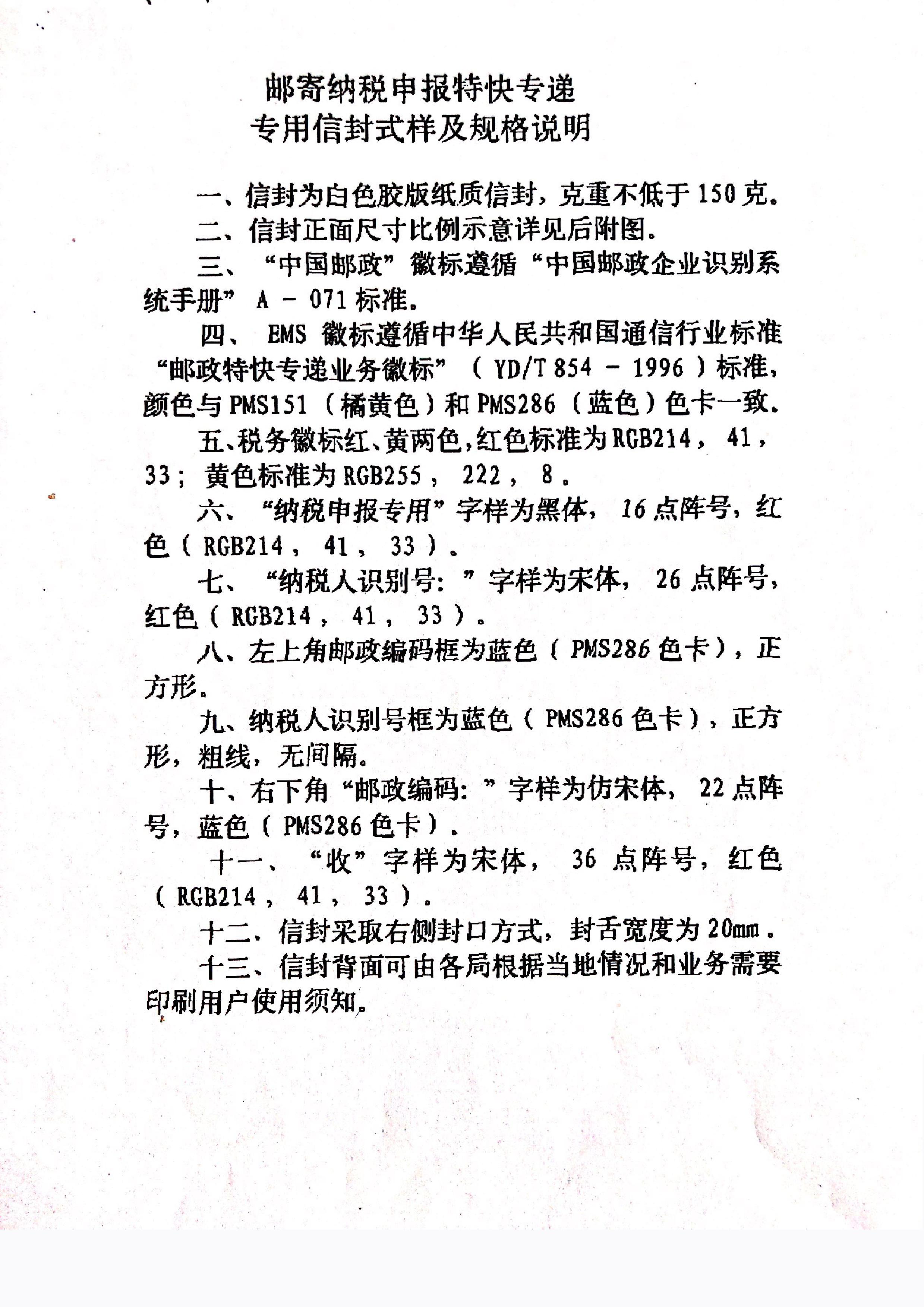 郵寄納稅申報(bào)專用信封,由各省、自治區(qū)、直轄市郵政管理局與同級稅務(wù)機(jī)關(guān)共同指定印刷廠承印,并負(fù)責(zé)監(jiān)制;由各地(市)、州、盟稅務(wù)局按照國家郵政局、國家稅務(wù)總局確定的式樣(附后)印制;由納稅人向主管稅務(wù)機(jī)關(guān)領(lǐng)購。