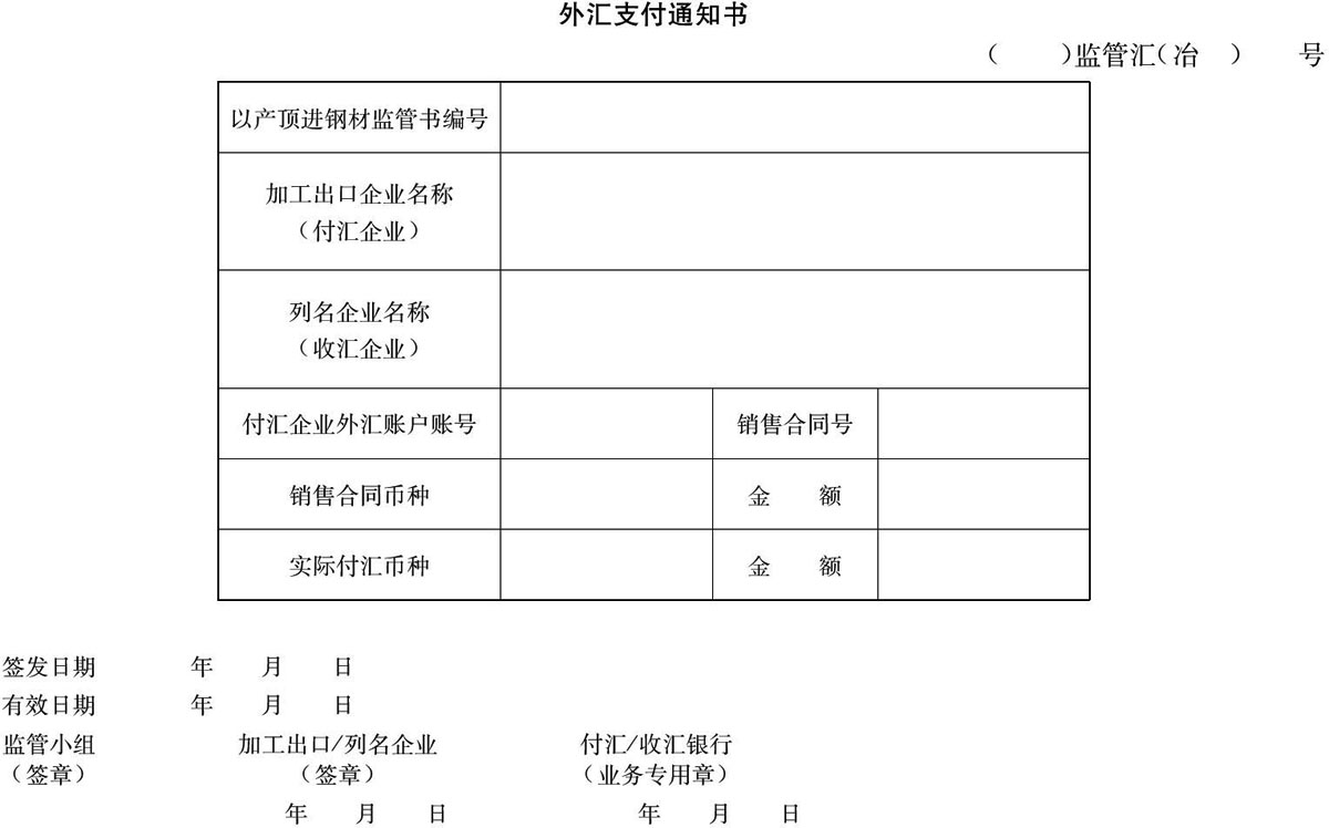????注:1.本通知書一式三聯(lián),第一聯(lián)交付匯銀行憑以辦理付匯業(yè)務(wù)并留存5年備查;第二聯(lián)交收匯銀行憑以辦理收匯和結(jié)匯業(yè)務(wù)并留存5年備查;第三聯(lián)由監(jiān)管小組留存。