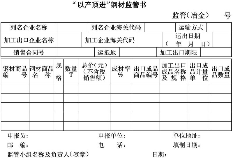????(二)在出口貨物報(bào)關(guān)單“稅費(fèi)征收情況”欄內(nèi)批注“以產(chǎn)頂進(jìn)鋼材監(jiān)管書監(jiān)管(冶金)×××××號(hào)”;
