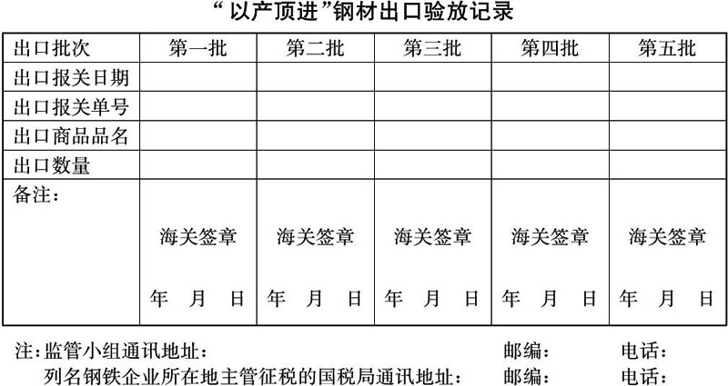 ????(三)在專用監(jiān)管書背面的“以產(chǎn)頂進(jìn)”鋼材成品出口驗(yàn)放記錄欄內(nèi)批注出口貨物情況。