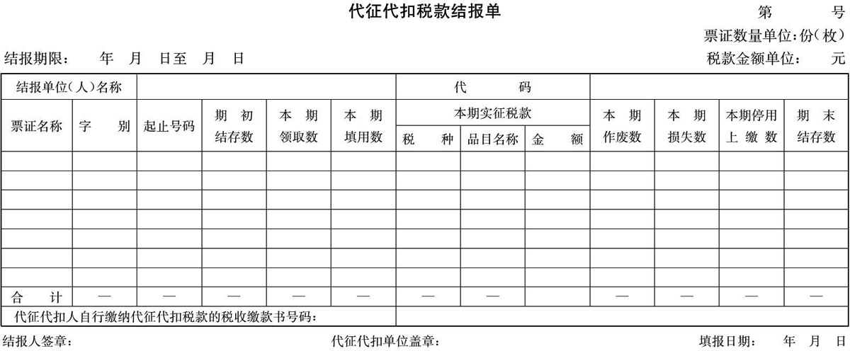 三、扣繳義務(wù)人代扣代收稅款后,在按規(guī)定向主管稅務(wù)機(jī)關(guān)報(bào)送代扣代收稅款報(bào)告表或結(jié)報(bào)票款時(shí),必須同時(shí)向稅務(wù)機(jī)關(guān)填報(bào)“代征代扣稅款結(jié)報(bào)單”(格式見附件1)。稅收會(huì)計(jì)以結(jié)報(bào)單作為核算代扣代收稅款和計(jì)付代扣手續(xù)費(fèi)的原始憑證。