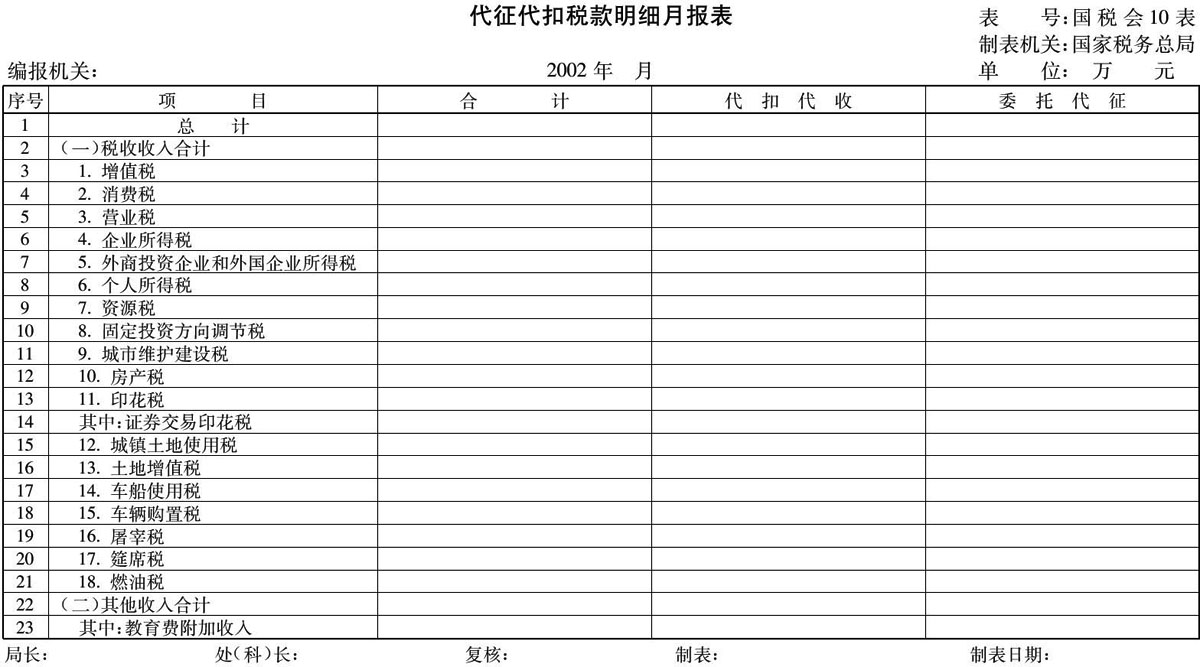 四、為準(zhǔn)確反映代征代扣稅款征收情況,2002年稅收會(huì)計(jì)報(bào)表中增設(shè)《代征代扣稅款明細(xì)月報(bào)表》(表式見附件2)。從2002年8月份編報(bào)7月份稅收會(huì)計(jì)報(bào)表起,各核算單位應(yīng)根據(jù)“代征代扣稅款登記簿”如實(shí)編報(bào)。同時(shí),取消《入庫(kù)稅金明細(xì)月報(bào)表》中“其中:銀行代征”、“其中:其他代征”和“其中:代扣代繳”三欄目。有關(guān)計(jì)算機(jī)表格及參數(shù)將通過(guò)廣域網(wǎng)下發(fā)各地。