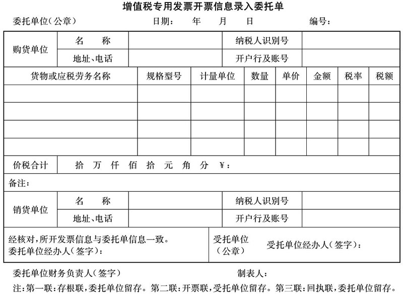 ????第十二條?中介機構(gòu)和稅務機關(guān)要嚴格按照納稅人提供的《增值稅專用發(fā)票開票信息錄入委托單》(樣式附后)錄入開票信息。已開具專用發(fā)票的《增值稅專用發(fā)票開票信息錄入委托單》由中介機構(gòu)和稅務機關(guān)按專用發(fā)票的保管年限保存。