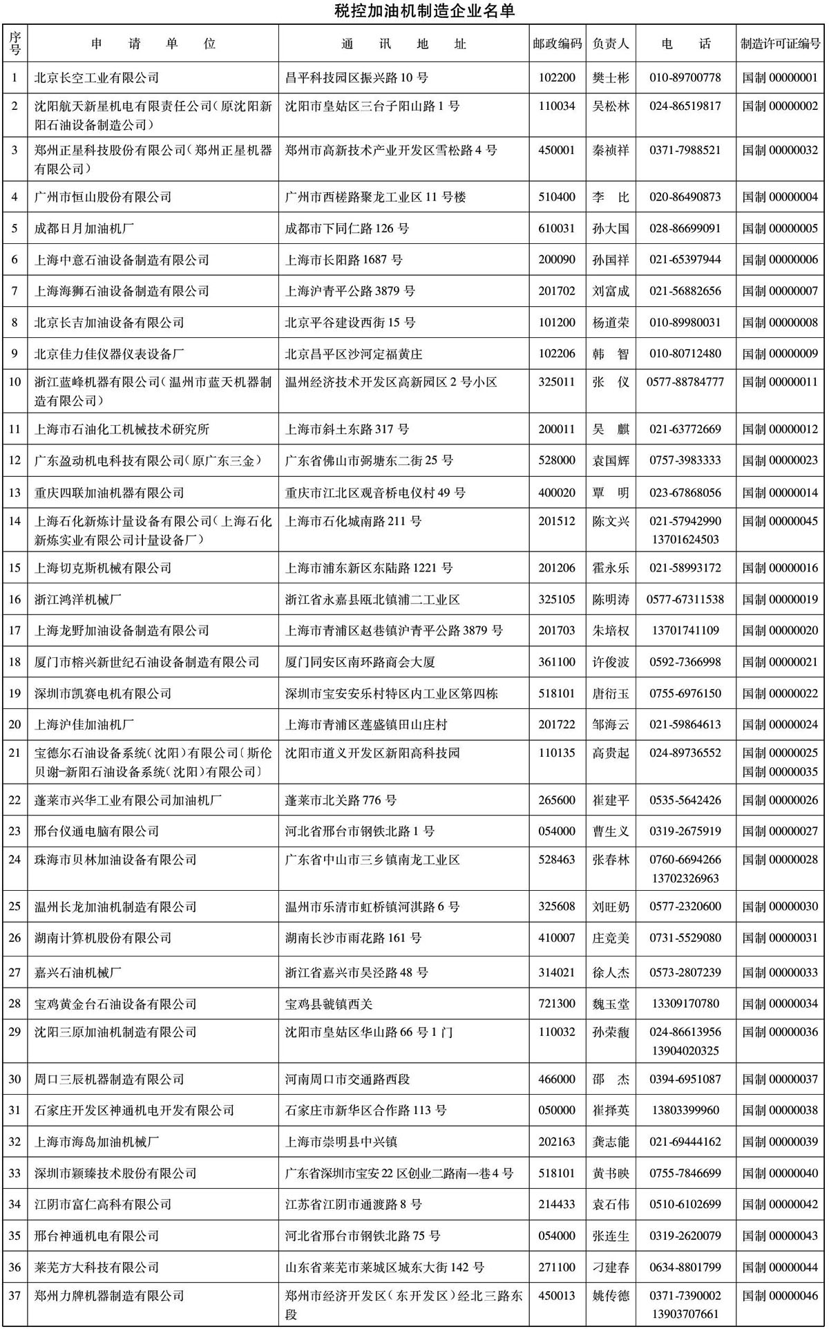 ????2.稅控燃油加油機制造企業(yè)要于2004年6月底以前,到各省級質(zhì)量技術監(jiān)督局重新?lián)Q發(fā)制造許可證,制造許可證的編號由各省按照質(zhì)技監(jiān)局量發(fā)〔1999〕108號文件規(guī)定的編號方法重新編號。此次換發(fā)的制造許可證的有效期從換證之日開始到原證書有效期止。