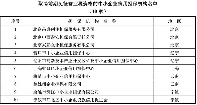 二、北京昌盛創(chuàng)業(yè)擔保服務有限公司等10家中小企業(yè)信用擔保機構(名單見附件二),取消其全國中小企業(yè)信用擔保體系試點資格,不再享受免征營業(yè)稅政策。
