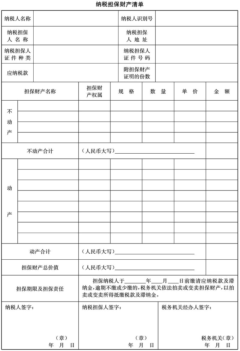 納稅擔保財產(chǎn)清單應(yīng)當寫明財產(chǎn)價值以及相關(guān)事項。納稅擔保書和納稅擔保財產(chǎn)清單須經(jīng)納稅人簽字蓋章并經(jīng)稅務(wù)機關(guān)確認。