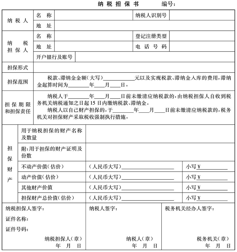 7.本擔保書為A4豎式,一式三份,經(jīng)納稅人、納稅擔保人、稅務(wù)機關(guān)三方簽字蓋章后,各留存一份。
