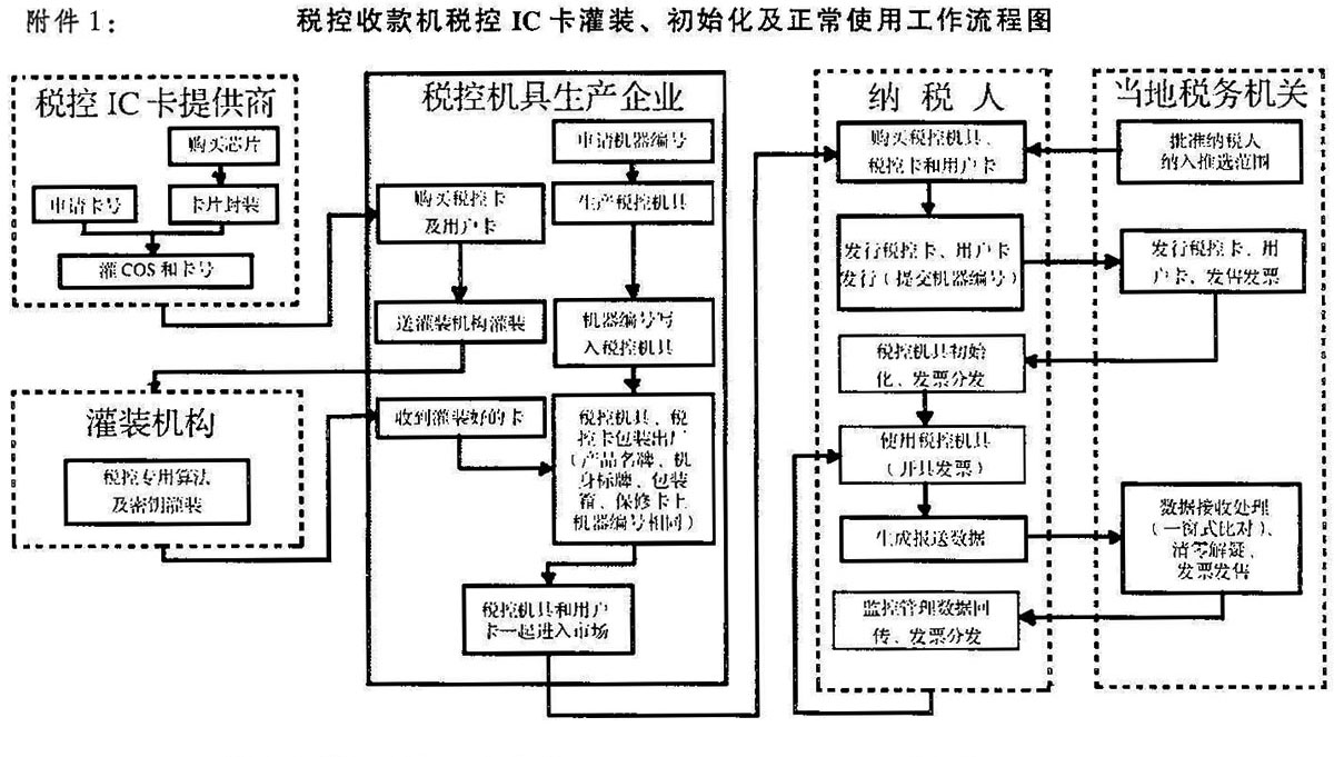具體流程圖見附件1:《稅控收款機稅控IC卡灌裝、初始化及正常使用工作流程圖》。