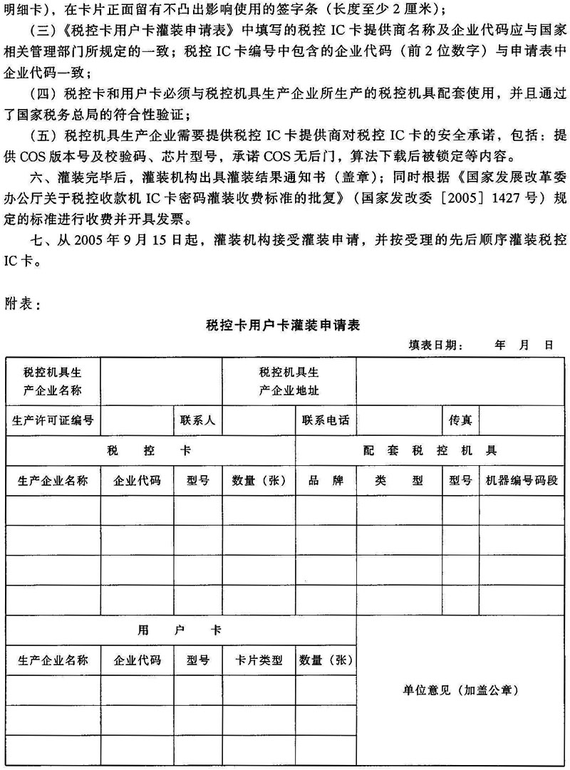 (一)稅控IC卡提供商將稅控IC卡銷售給稅控機具生產(chǎn)企業(yè)前,應按稅控收款機國家標準(GB 18240)的要求將稅控IC卡編號(以下簡稱:卡號)寫入稅控IC卡內,并印刷在稅控IC卡表面??ㄌ枒蛳嚓P管理部門申請。