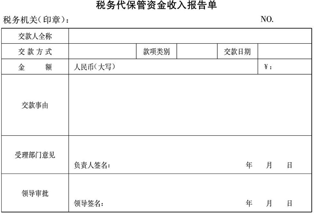 ????第十條?稅務機關(guān)收取稅務代保管資金應當填制《稅務代保管資金收入報告單》(格式見附件1),經(jīng)稅務機關(guān)主要負責人批準,存入稅務代保管資金賬戶。