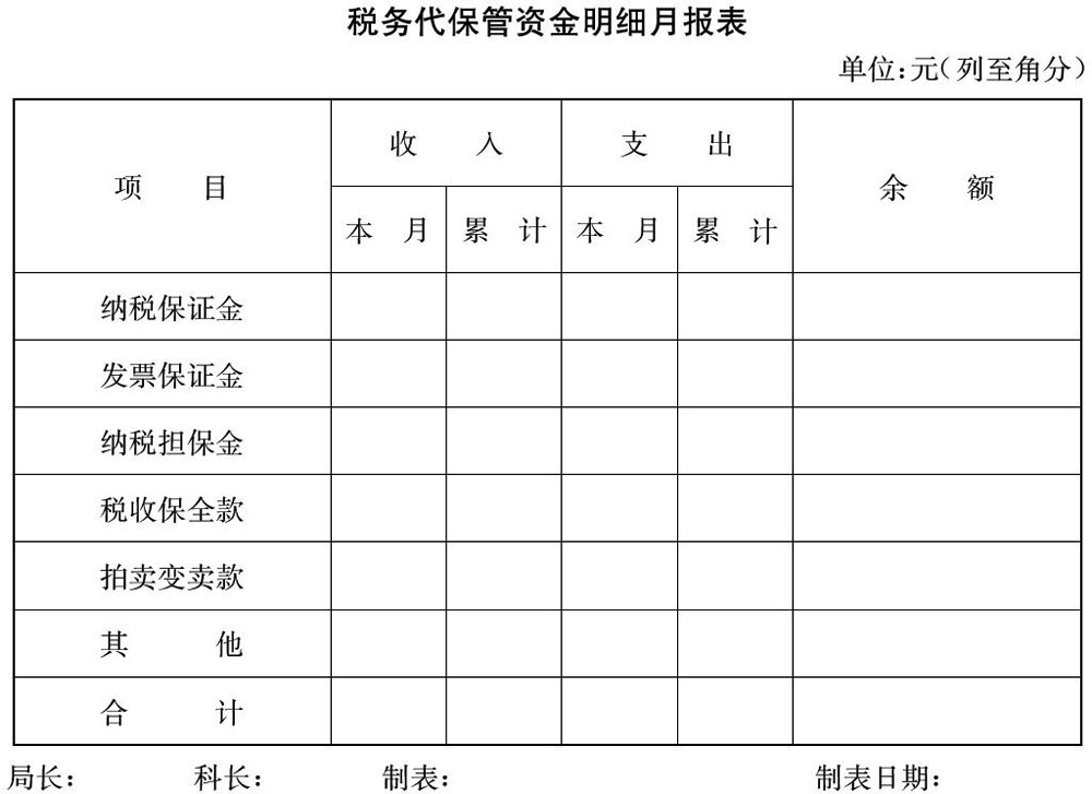 ????第二十九條?各核算單位應當按期向上一級稅務機關(guān)編報《稅務代保管資金明細月報表》(格式見附件4),以月度為報表期,以年度為決算期,按照稅務代保管資金的內(nèi)容詳細反映稅務代保管資金收支變動情況。