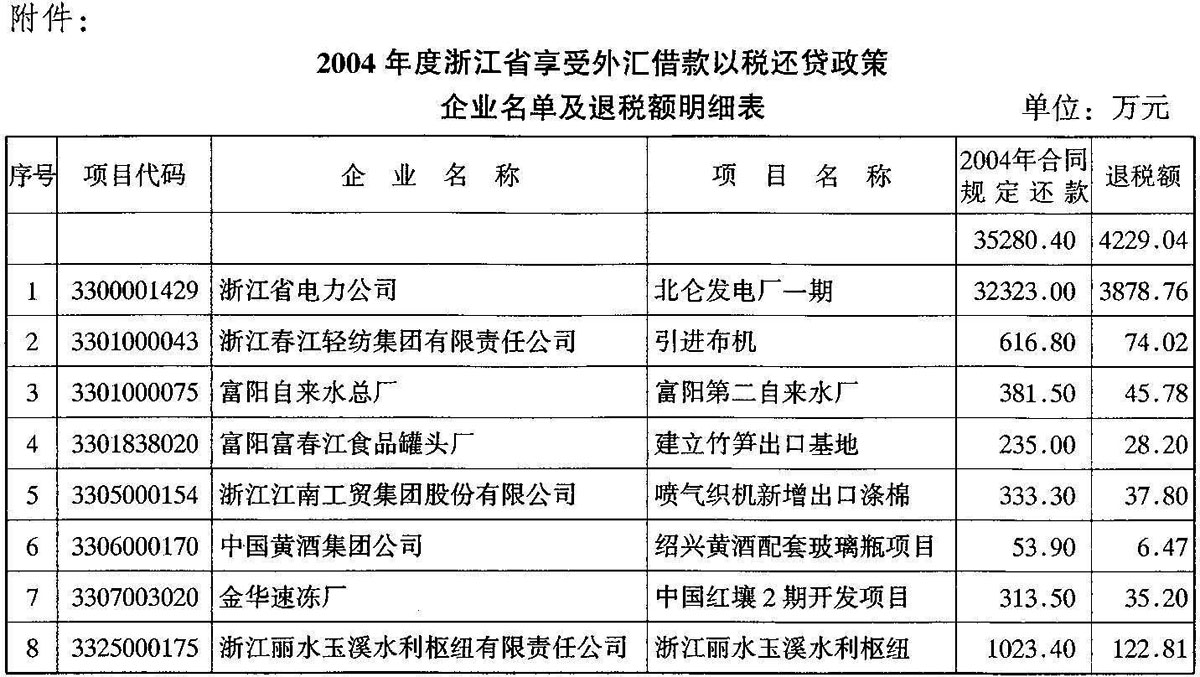 附件:2004年度享受外匯借款以稅還貸政策企業(yè)名單及退稅額明細表