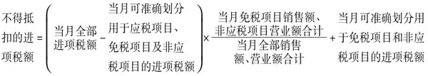 納稅人兼營(yíng)免稅項(xiàng)目或非應(yīng)稅項(xiàng)目(不包括固定資產(chǎn)在建工程)無(wú)法準(zhǔn)確劃分不得抵扣的進(jìn)項(xiàng)稅額部分,按下列公式計(jì)算不得抵扣的進(jìn)項(xiàng)稅額: