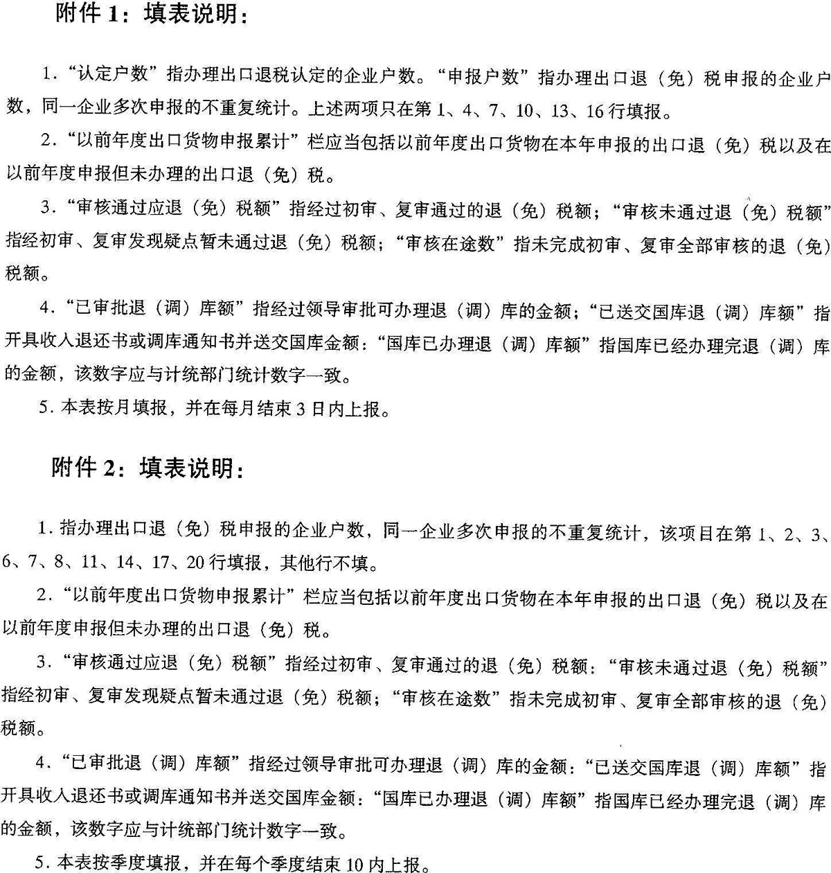 ????三、取消出口貨物退(免)稅清算后,稅務(wù)機(jī)關(guān)應(yīng)進(jìn)一步加強(qiáng)出口貨物退(免)稅的日常管理,做好相關(guān)數(shù)據(jù)的統(tǒng)計(jì)、上報(bào)工作。各省、自治區(qū)、直轄市和計(jì)劃單列市國(guó)家稅務(wù)局應(yīng)于每月3日前(節(jié)假日順延)將《出口貨物退(免)稅進(jìn)度月報(bào)表》(附件1)上報(bào)總局(進(jìn)出口稅收管理司);每季度結(jié)束后10日內(nèi),將《特殊政策退(免)稅季度統(tǒng)計(jì)表》(附件2)、《出口卷煙免稅情況統(tǒng)計(jì)季報(bào)表》(附件3)上報(bào)總局(進(jìn)出口稅收管理司)。