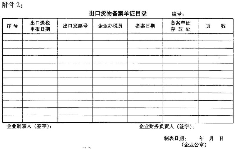 ????第一種方式:由出口企業(yè)按出口貨物退(免)稅申報順序,將備案單證對應(yīng)裝訂成冊,統(tǒng)一編號,并填寫《出口貨物備案單證目錄》(見附件2)。
