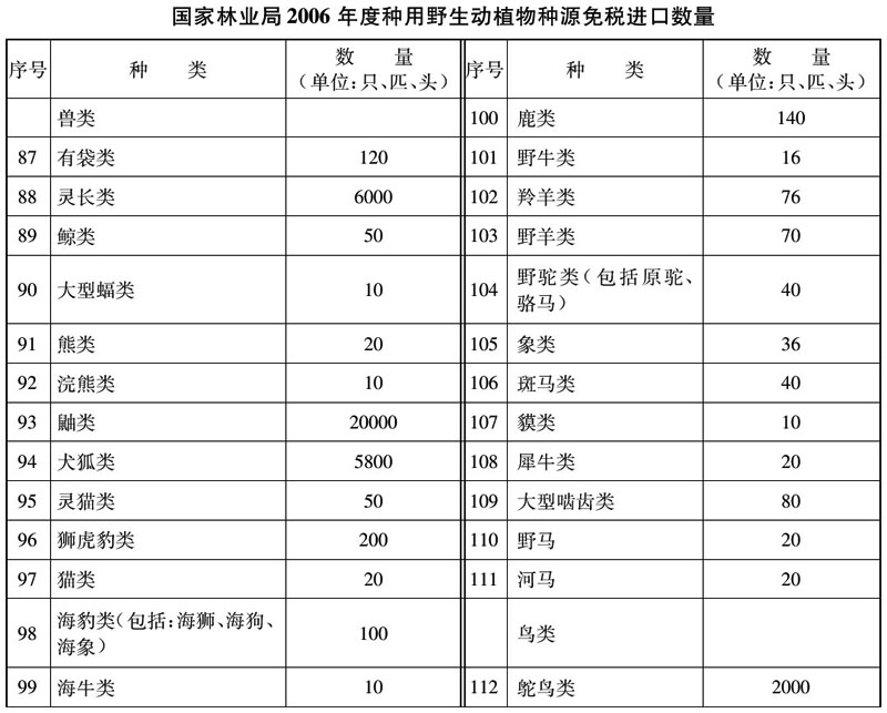 2.國家林業(yè)局2006年度種用野生動植物種源免稅進口數(shù)量