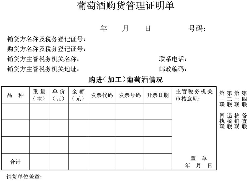 ????第四條?境內(nèi)從事葡萄酒生產(chǎn)的單位或個人(以下簡稱生產(chǎn)企業(yè))之間銷售葡萄酒,實行《葡萄酒購貨證明單》(以下簡稱證明單,見附件1)管理。證明單由購貨方在購貨前向其主管稅務(wù)機關(guān)申請領(lǐng)用,銷貨方憑證明單的退稅聯(lián)向其主管稅務(wù)機關(guān)申請已納消費稅退稅。
