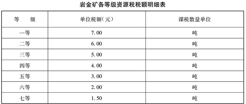 一、調(diào)整各等級巖金礦資源稅稅額標(biāo)準(zhǔn),具體標(biāo)準(zhǔn)見《巖金礦各等級資源稅稅額明細(xì)表》(附件1)。