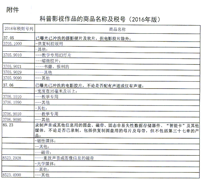 附件:科普影視作品的商品名稱及稅號(2016年版)