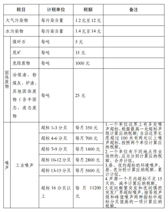 第六條 環(huán)境保護(hù)稅的稅目、稅額,依照本法所附《環(huán)境保護(hù)稅稅目稅額表》執(zhí)行。