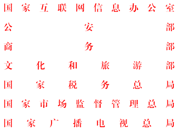 發(fā)文單位:國家互聯(lián)網(wǎng)信息辦公室 公安部 商務(wù)部 文化和旅游部 國家稅務(wù)總局 國家市場監(jiān)督管理總局 國家廣播電視總局
