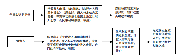 繳費(fèi)人繳納的競買保證金需抵作土地出讓收入的,由保證金收取單位代繳費(fèi)人向稅務(wù)機(jī)關(guān)申報繳納。以繳費(fèi)人名義申報時,可以采取銀行端查詢繳稅方式,通過辦稅服務(wù)廳或網(wǎng)上辦稅系統(tǒng)生成《銀行端查詢繳稅憑證》,經(jīng)保證金收取單位簽章確認(rèn)后,送交收取競買保證金的銀行劃繳入庫。