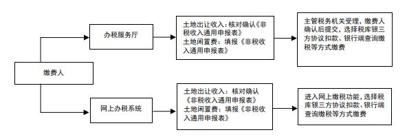 繳費(fèi)人依據(jù)《征繳土地閑置費(fèi)決定書》規(guī)定的金額和付款期限,通過網(wǎng)上辦稅系統(tǒng)或辦稅服務(wù)廳向主管稅務(wù)機(jī)關(guān)提交《非稅收入通用申報表》,完成土地閑置費(fèi)申報繳費(fèi)。